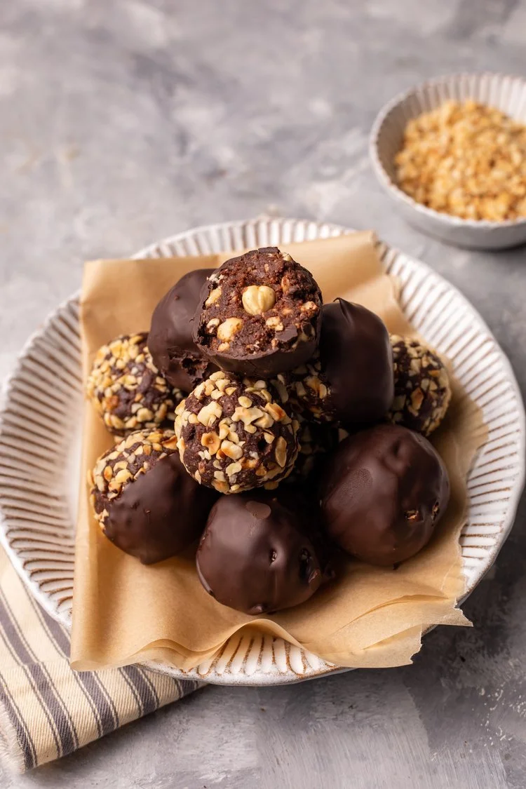 Each ball is topped with a whole hazelnut and coated in crushed hazelnuts for a crunchy texture. The finished product can be coated in a blend of melted dark chocolate and coconut oil for a perfectly decadent finish. Chill for 1 hour and enjoy! Perfect for sharing or storing as a sweet snack in the fridge.